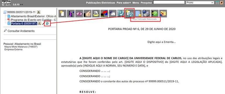 O SEI vai gerar uma cópia do documento, inclusive com a mesma numeração, que será a Publicação Relacionada, sendo possível alterar o conteúdo e realizar um novo agendamento