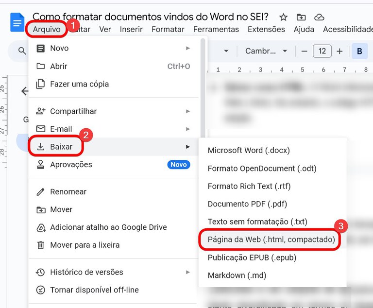- Abra o arquivo a ser exportado e clique em Arquivo > Baixar > Página da Web (*.html, compactado);
