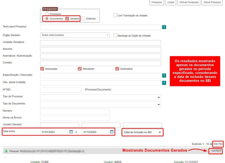 Observe que os resultados mostrarão tanto os processos quanto os documentos gerados no período especificado, considerando a data de inclusão desses processos no SEI.